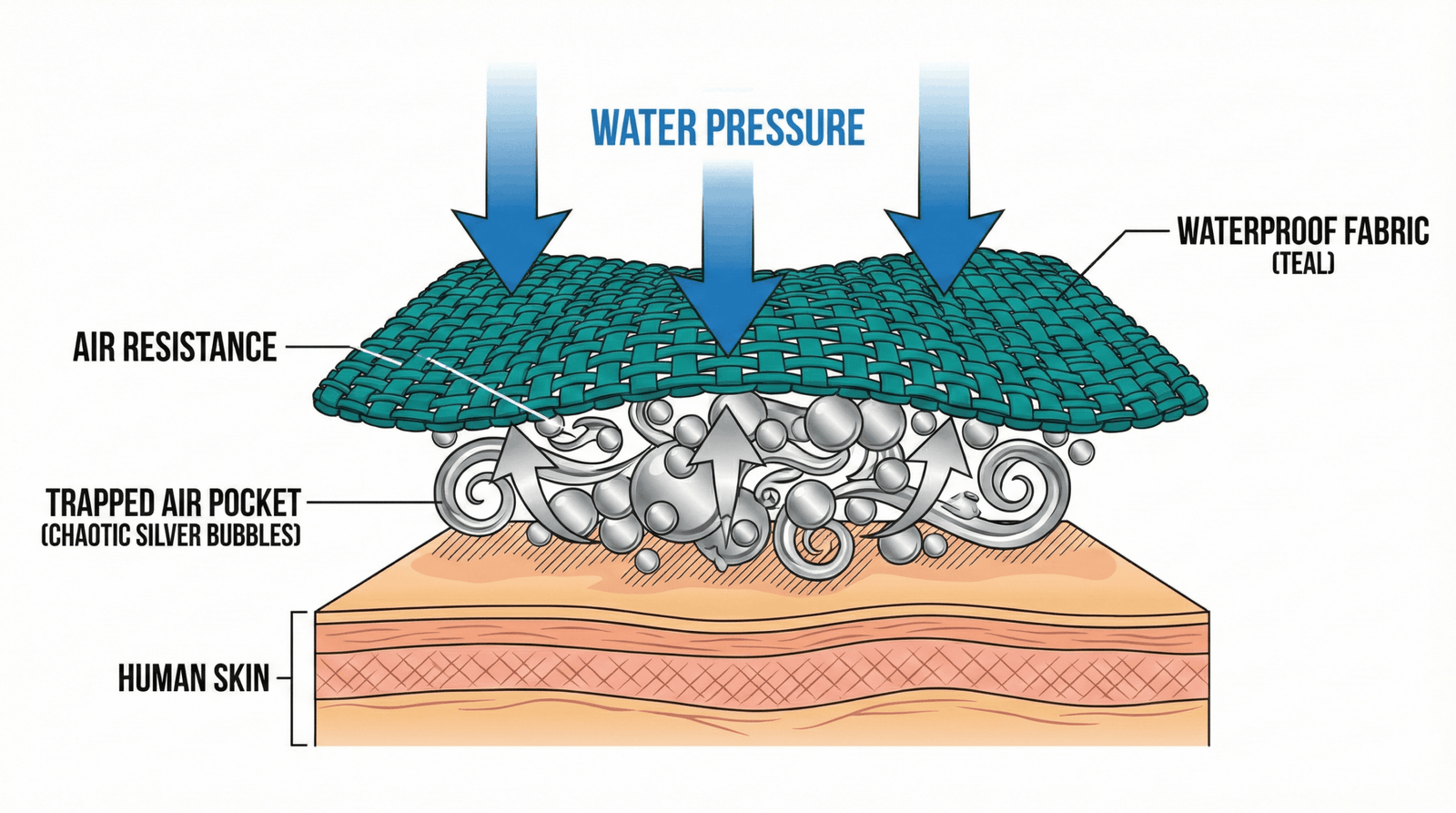 If your suit feels like a raincoat, it will act like a balloon. You want a Spandex/Nylon blend that allows water to pass through the weave slightly, rather than a solid rubberized sheet.