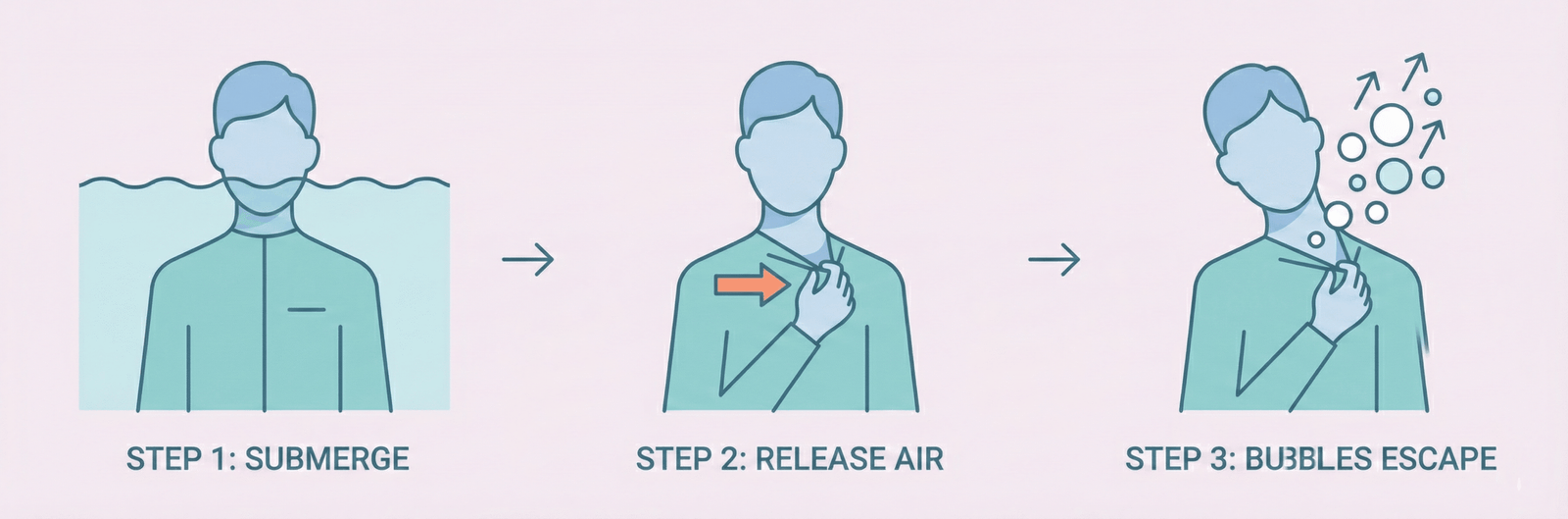 - The Squeeze: Press the fabric back against your body to force any remaining air bubbles out through the neck opening.