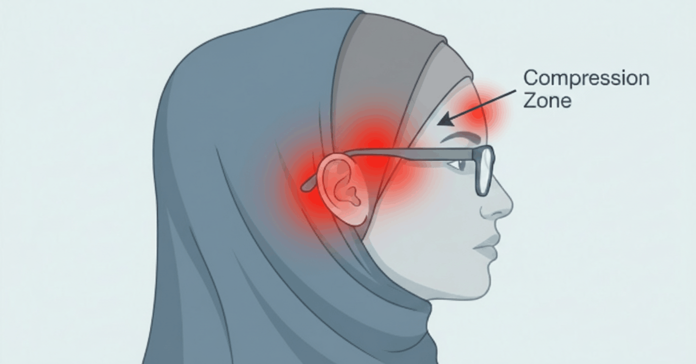 When you wear a standard tube cap or pull your hijab tight, you create a compression zone right around your temples.