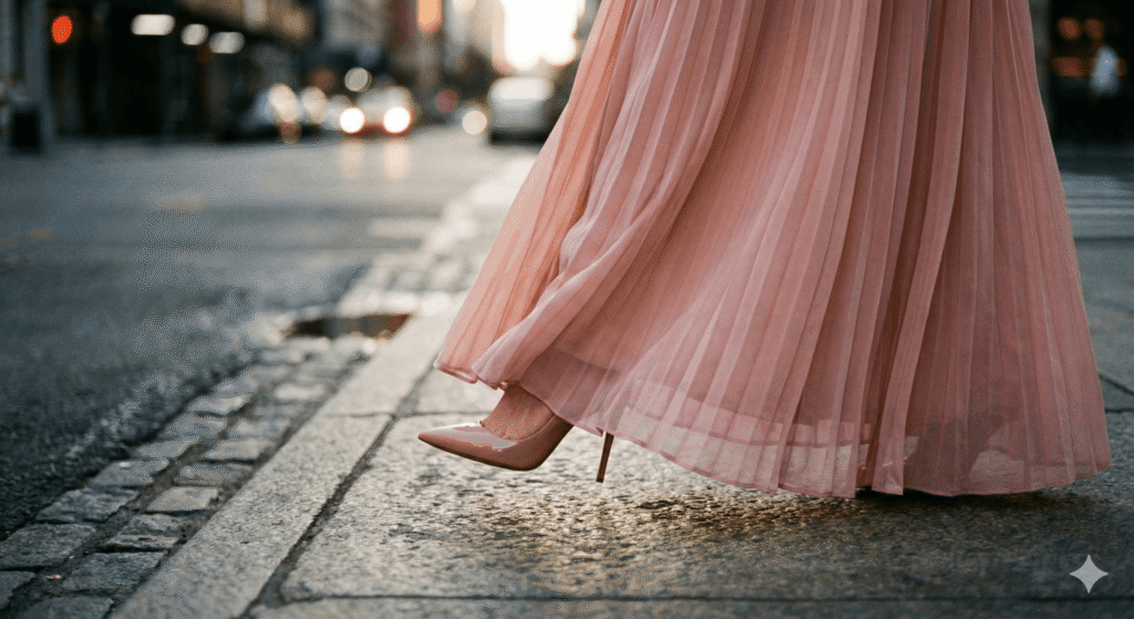 - Nude vs. Contrast If your feet are visible, wear shoes that match your skin tone (“nude”). This makes your foot look like an extension of your leg. Black shoes on pale skin (or vice versa) create a “stump” effect at the bottom of the column.
